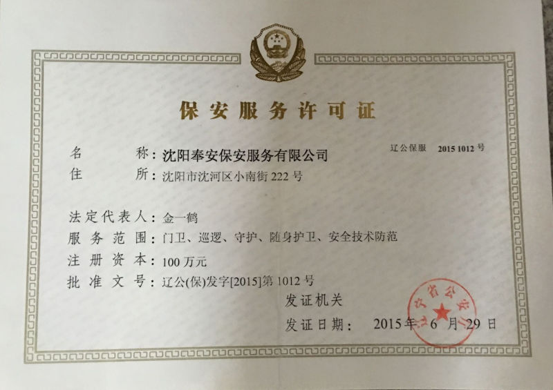 沈陽奉安保安服務有限公司(原沈陽市沈河區(qū)保安服務公司)創(chuàng)建于一九八八年八月,是遼寧省公安廳、沈陽市公安局批準,工商行政部門登記注冊,全市首家具備保安資質的特殊性服務企業(yè),隸屬于沈陽市沈河區(qū)政府直管的全民國有企業(yè),現為中國保安協(xié)會會員單位和省保協(xié)、市保協(xié)常務理事單位:在全市同行業(yè)中率先通過ISO國際質量認證,是市工商局批準的“重合同守信用”免檢單位和沈陽市政府采購中心保安服務項目重點競標單位;擁有一支專業(yè)化、標準化、職業(yè)化的高素質保安隊伍,是公安機關重要的輔警力量。